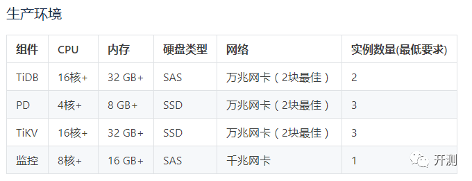 部署一套集群至少需要5台机器,2TiDB,3TikV,PD可以和TiDB部署在同服务器上。