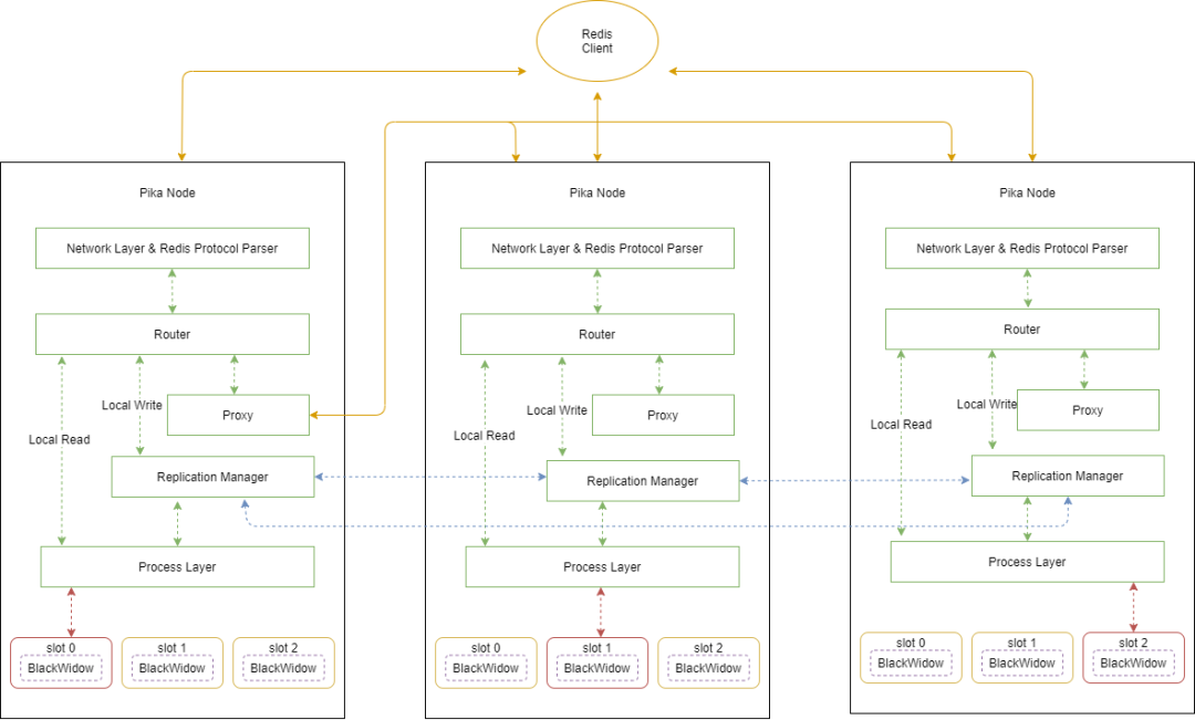 以3个pika节点的集群为例,集群部署结构如上图所示: