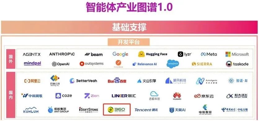 为梳理和推广智能体技术创新与行业应用实践,加速智能体技术创新与产业深度融合,6月16日上午,中国信息通信研究院编制的“智能体产业图谱1.0”(以下简称“图谱”)正式发布。图谱收录了近200家聚焦智能体技术创新和产业应用的企业,三六零(601360.SH,下称“360”)集团与华为、阿里、腾讯等企业首批入选基础支撑开发平台。