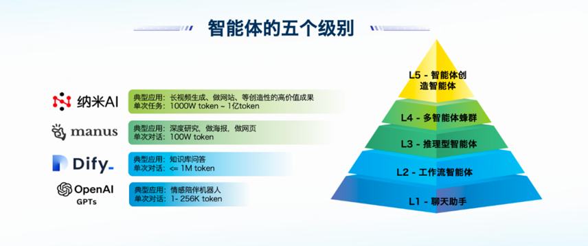 不过,我们也要认识到,不同级别的智能体融入个体工作与企业发展的形式将有所差别。第一级(L1)是聊天助手,比如ChatGPT、GPTs等,通过提示词来作角色扮演,通过聊天实现与人的交流,多应用于客服、用工培训等;第二级(L2)是工作流智能体,应用于可实现准确结果的固定流程任务,灵活性较低;第三级(L3)是推理型智能体,无须告诉其工作流程,只要告诉其工作目标、职责等即可,适合创造性、开放性任务,如写小说、做PPT、深度研究等;第四级(L4)是多智能体蜂群,多个智能体灵活组队有机协作,共同完成复杂任务;第五级(L5)是人工智能的自我进化,无须人来定义,目前正在探索中。