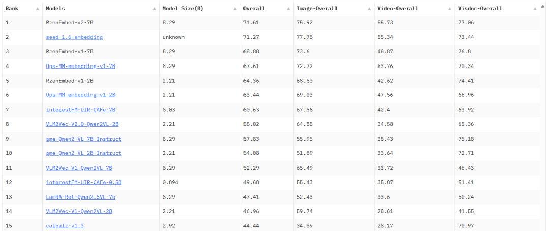 RzenEmbed-v2-7B在MMEB榜单上获得总排名+单项双Top1的佳绩