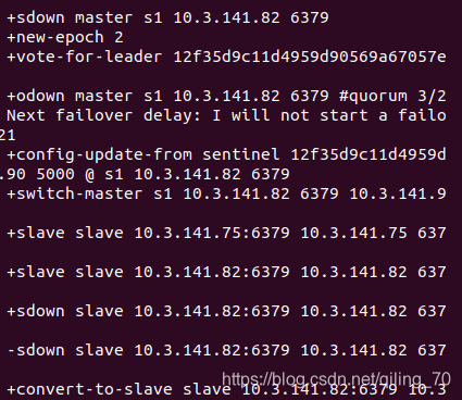 此时sentinel可以报告+sdown、+odown、+config-update-from、+switch-master、+slave、-sdown、+convert-to-slave整个过程(+sdown、+odown这些都是sentinel的频道,可以订阅以获取对应信息,或者 psubscribe * 获取全部类型的信息)。