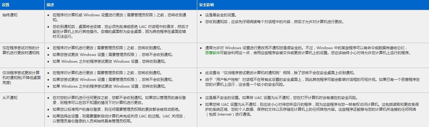 下表描述了 UAC 设置以及其中每个设置对计算机安全的潜在影响。
