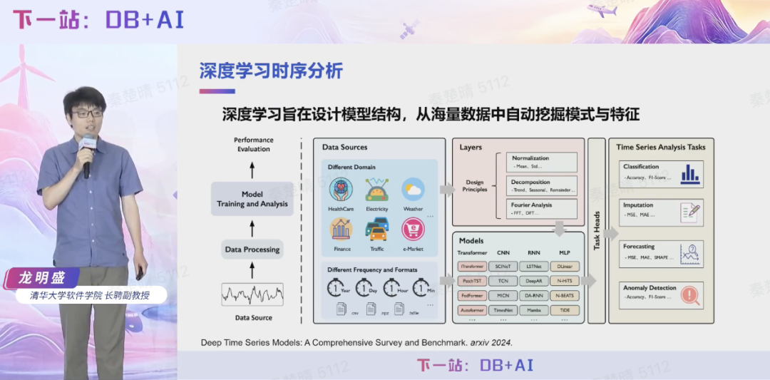 龙明盛教授系统回顾了清华团队在时序大模型领域的研究历程与技术探索。团队在过去五年中构建了完整的时序分析技术栈,从数据预处理发展至深度学习模型,最终形成涵盖 FFT 频域变换、数据分解、归一化等分析算子的自研时序大模型成果。