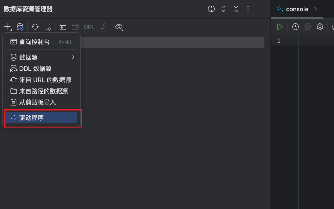 1. 左侧边栏点击 + 新建图标 -> 选择数据源 -> 选择上面新建的用户驱动程序。