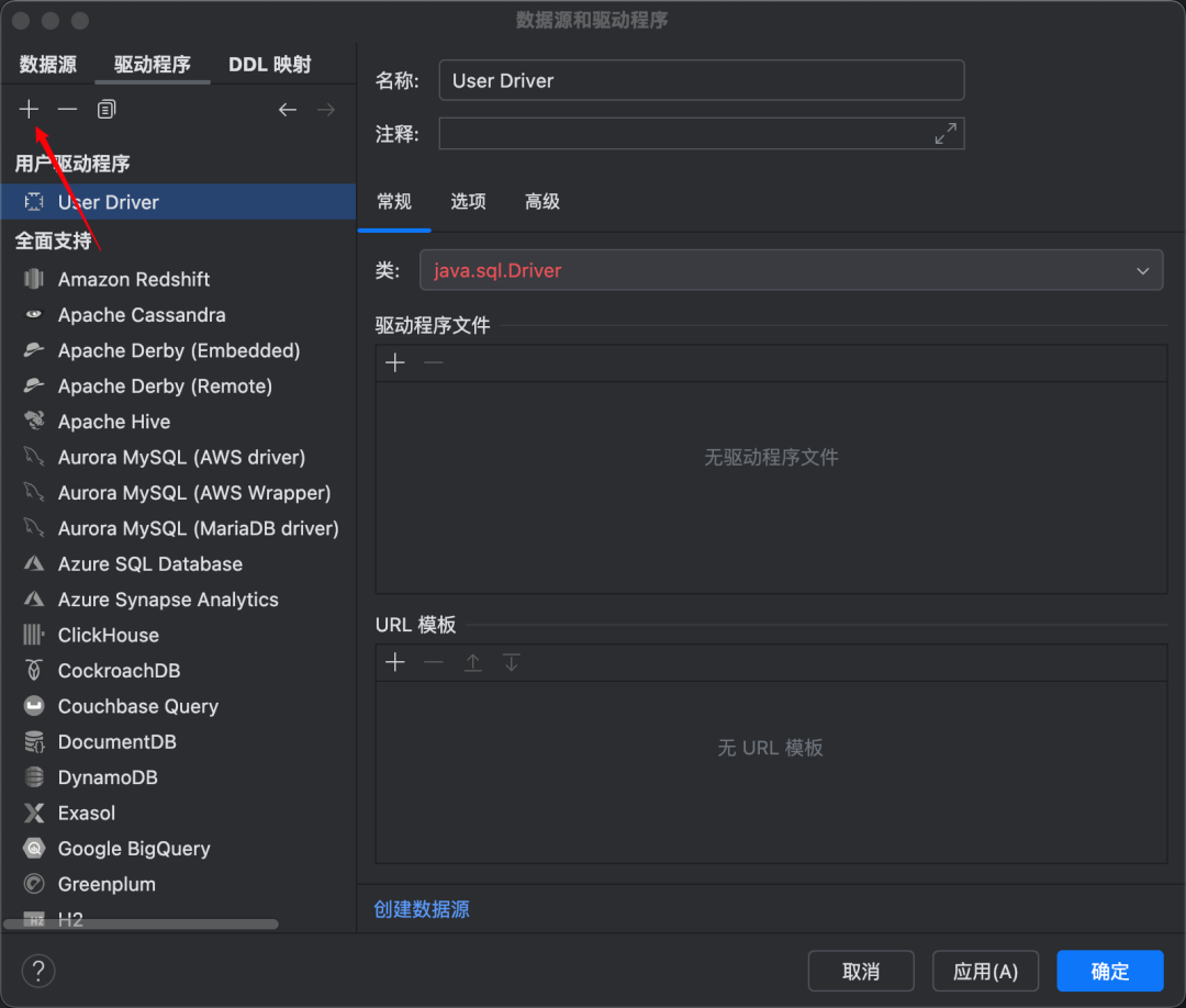1. 配置【驱动】信息,在创建新驱动程序窗口中,点击 + 新建按钮。