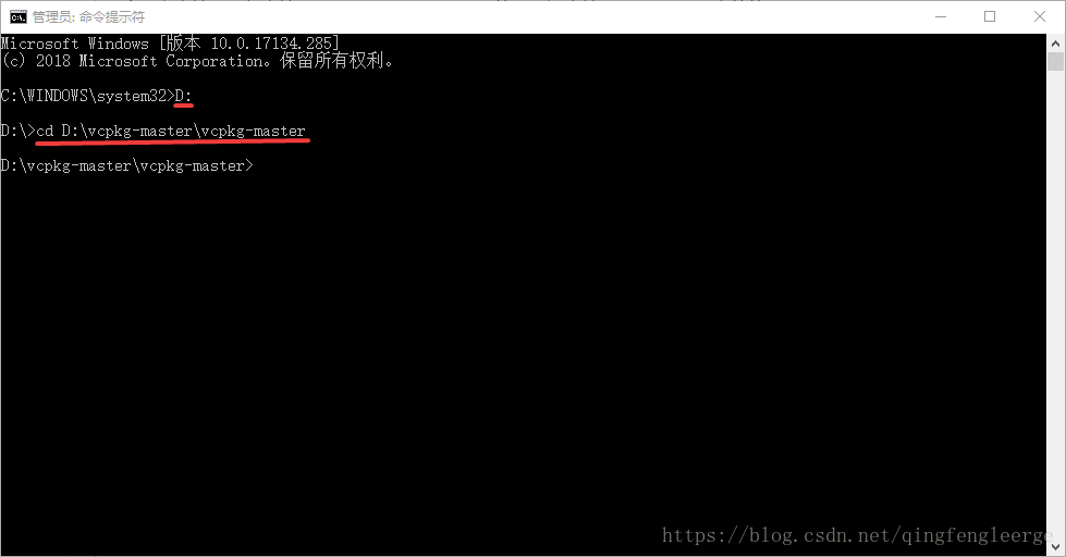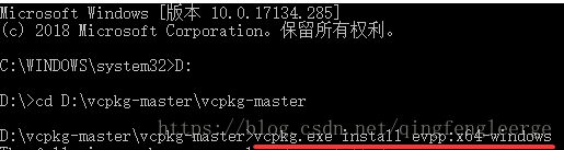 以管理员的方式运行命令提示符——打开提示符窗口——输入安装vcpkg的盘符——cd切换到具体的文件夹