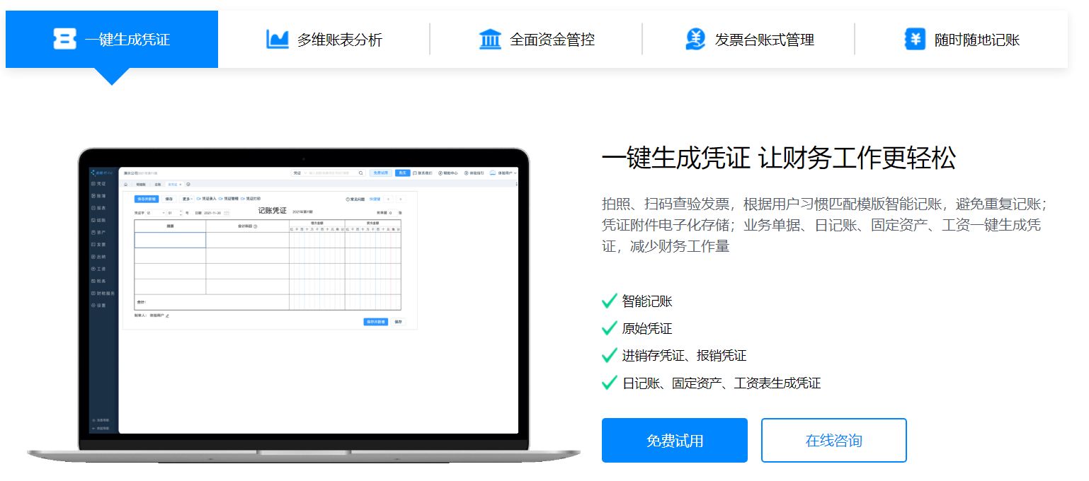 软件功能丰富、齐全,能够满足企业财务管理不同阶段、不同功能的需求,简单易用,可以一键生成凭证、一键报税、多维度账表分析等,极大提升企业财务人员工作效率。价格上也相对平民化,对于中小企业而言比较友好。