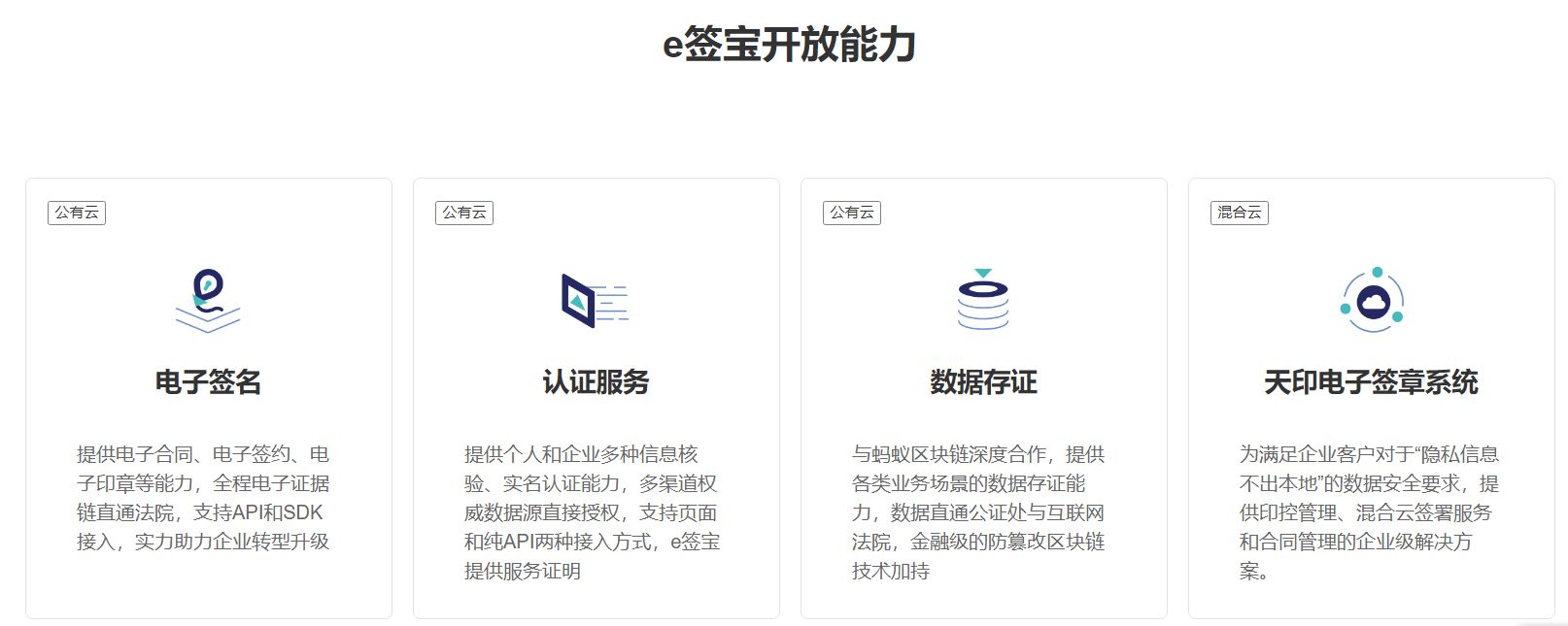 e签宝产品和服务非常丰富且多样化,应用先进,签署方式多样,支持全渠道、多形态的部署方式,如SaaS API、钉钉、支付宝、微信小程序,企业内部OA等,对于公有云(成长型企业)、混合云(集团型企业)、行业云(公共事业)等都可提供不同的产品来满足其个性化需求。