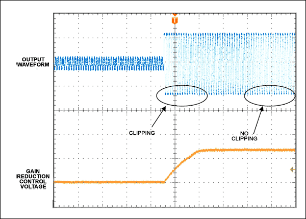 图4是设置阈值刚好低于放大器最大输出功率时的效果。输入信号是高低幅度交错的正弦波。输出波形在响应时间内被明显削波,但是当增益衰减完成后,即可避免削波现象。