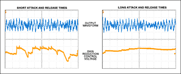 通过监测增益衰减控制电压和信号波形(图3),可以观察到较长和较短响应、释放时间的效果。为了产生有代表性的波形,输入信号采用的是满音量的音频信号。在总体信号强度相对恒定的波形中,较短的响应和释放时间会导致频繁的增益调整。而较长的响应和释放时间则维持平滑的增益响应,避免放大器响应过快,从而在基本保留动态范围的同时维持整个信号的幅度。