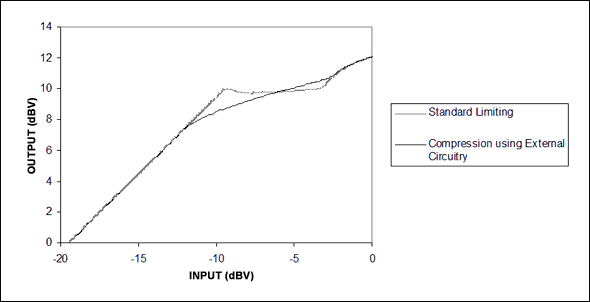 图6. 与MAX9756标准限幅配置相比,配合外部电路后能够得到平缓的增益调节。
