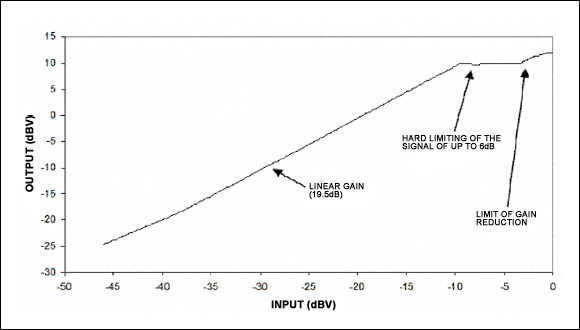 图1. 对于低电平音量,放大器如同一个普通的线性放大器;当音量超过阈值时,缩减增益以避免输出超出门限。当输出电压增大到门限以上时,最大增益衰减量限制在6dB。