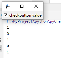 #将一整数与Checkbutton的值绑定,每次点击Checkbutton,将打印出当前的值
