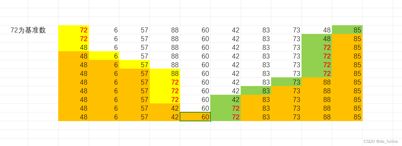 1. 第一步便是找到基准数,开始分区:基准数可以选择第一个,最后一个,也可以是随机的(为了便于理解,以下的图都默认选的是第一个,当然代码是随机的,重要的是先把交换三个数的本质理解到)