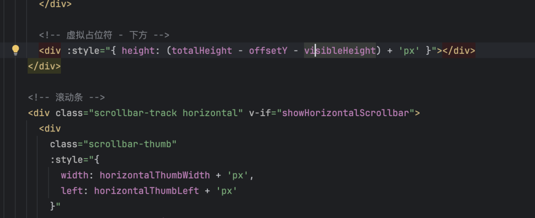 VirtualRow 就是我封装的虚拟行组件,实现原理就是利用可视高度和行的高度计算下次渲染的时机,同时减少一次加载大量 dom 节点。我会用一个空白占位符来监控滚动高度变化: