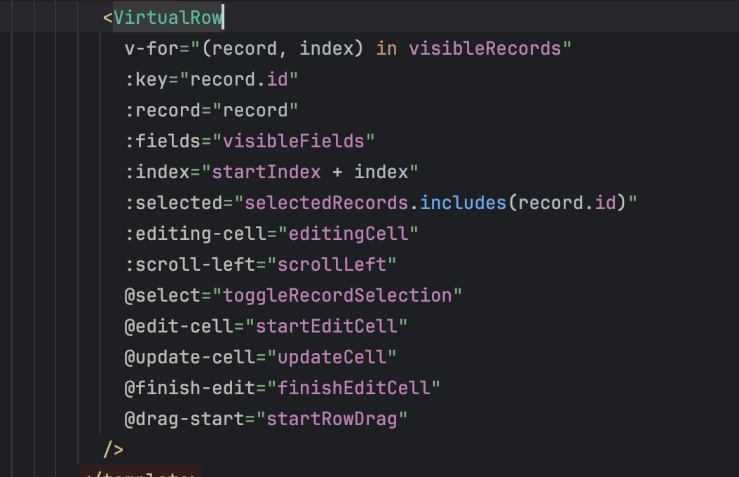 // 列拖拽const startColumnDrag = (event: DragEvent, index: number) => { if (event.dataTransfer) { event.dataTransfer.setData('text/plain', index.toString()) event.dataTransfer.effectAllowed = 'move' }}// 行拖拽const startRowDrag = (event: DragEvent, record: Record, index: number) => { if (event.dataTransfer) { event.dataTransfer.setData('application/json', JSON.stringify({ record, index })) event.dataTransfer.effectAllowed = 'move' }}// 水平滚动条拖拽const startHorizontalDrag = (event: MouseEvent) => { event.preventDefault() const startX = event.clientX const startScrollLeft = scrollLeft.value const containerWidth = containerRef.value?.clientWidth || 0 const maxScroll = totalWidth.value - containerWidth