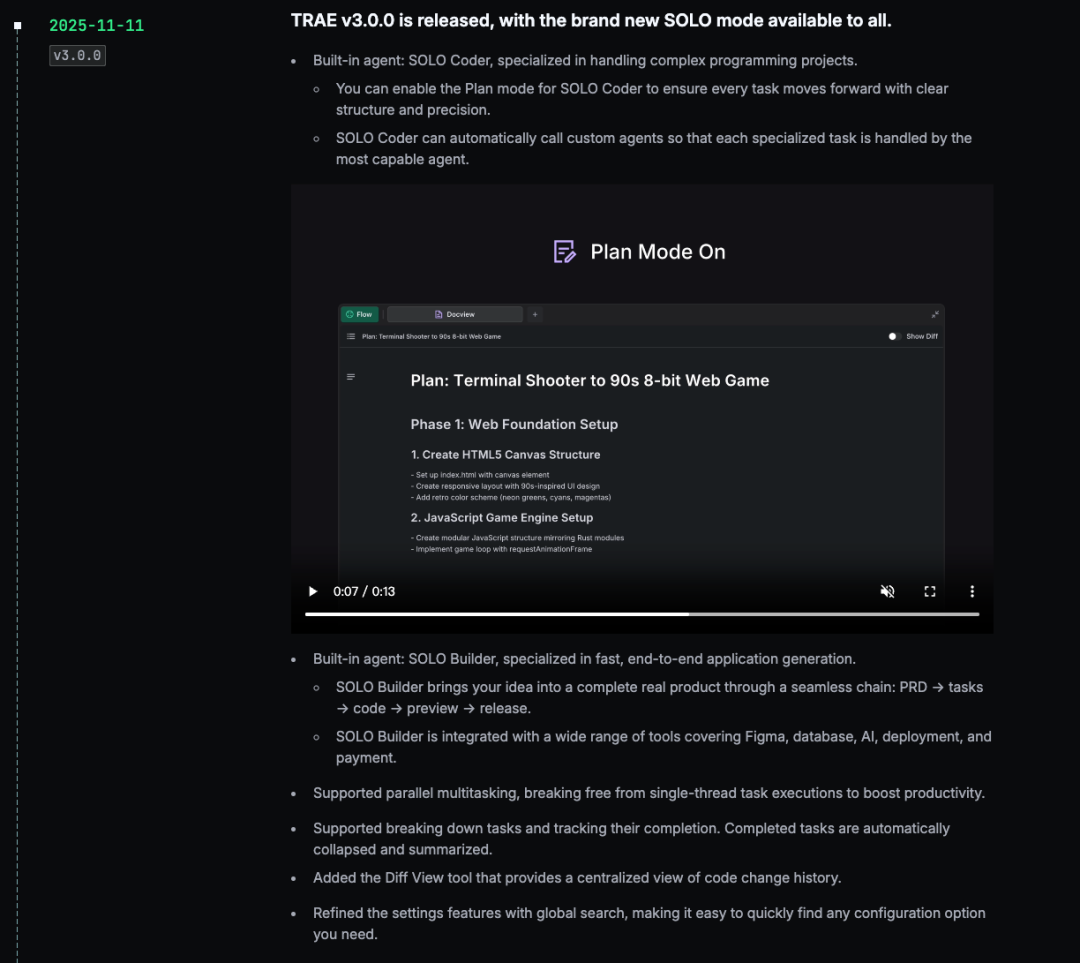 除了 SOLO 模式,Trae v3.0.0 还有一些其他重要更新。