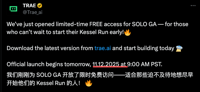 Trae v3.0.0 发布了,令人激动的是,刚刚,Trae 宣布 SOLO 模式正式上线,并且限时全员免费!此前 Solo 模式需要邀请码才能使用。除此之外 SOLO 模式还做了全新升级,SOLO Coder 和 SOLO Builder 都得到了增强。