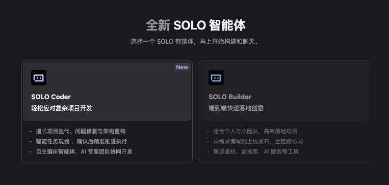 Trae 在 SOLO 模式中内置了两个核心智能体。第一个叫 SOLO Coder,第二个叫 SOLO Builder。这两个智能体各有分工,一个专注复杂项目,一个专注快速开发。