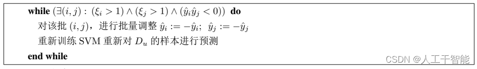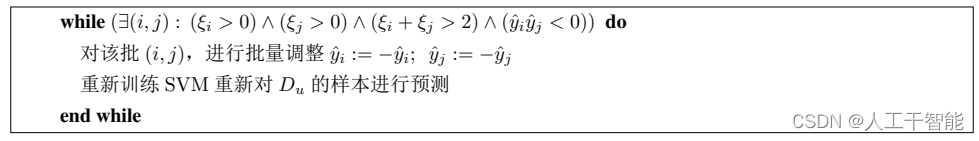 然而,上述对(2.2)的修订破坏了初始化时得到的 D u D_u Du伪标记 { y ^ i } i = l + 1 l + u \{\hat{y}_i\}_{i=l+1}^{l+u} {y^i}i=l+1l+u中正反例的比例。 由于初始化 D u D_u Du伪标记是由有监督学习基于 D l D_l Dl训练 S V M l \mathrm{SVM}_l SVMl来预测得到的,虽然对个体的预测可能不准确,但认为总体上正、反例的比例正确。 为了不破坏这个比例关系,应在 D u + D_u^+ Du+与 D u − D_u^- Du−之间,配对反号:即一个由正改负,另一个由负改正,式子表示为: y ^ i : = − y ^ i ; y ^ j : = − y ^ j ( y ^ i y ^ j < 0 ) \hat{y}_i:=-\hat{y}_i ;\ \hat{y}_j:=-\hat{y}_j(\hat{y}_i\hat{y}_j<0) y^i:=−y^i; y^j:=−y^j(y^iy^j<0)。