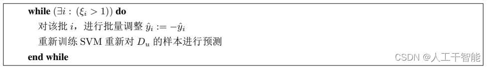 (2.2)用新的 S V M l \mathrm{SVM}_l SVMl重新预测 D u D_u Du中的样本,更新 { y ^ i } i = l + 1 l + u \{\hat{y}_i\}_{i=l+1}^{l+u} {y^i}i=l+1l+u;