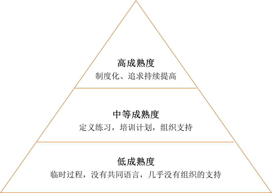 尽管术语上有所差别,但是这些模型的逻辑相对比较一致,他们都假设企业最初没有项目实施计划,也不存在组织级的集中,随之项目制的成熟,企业接受通用的做法,进行知识的培训,为项目管理制定制度和流程,最终对项目管理技术和流程进行持续改进和优化。因此我们可以把这个模型做一个简化,形成下图的三层金字塔。
