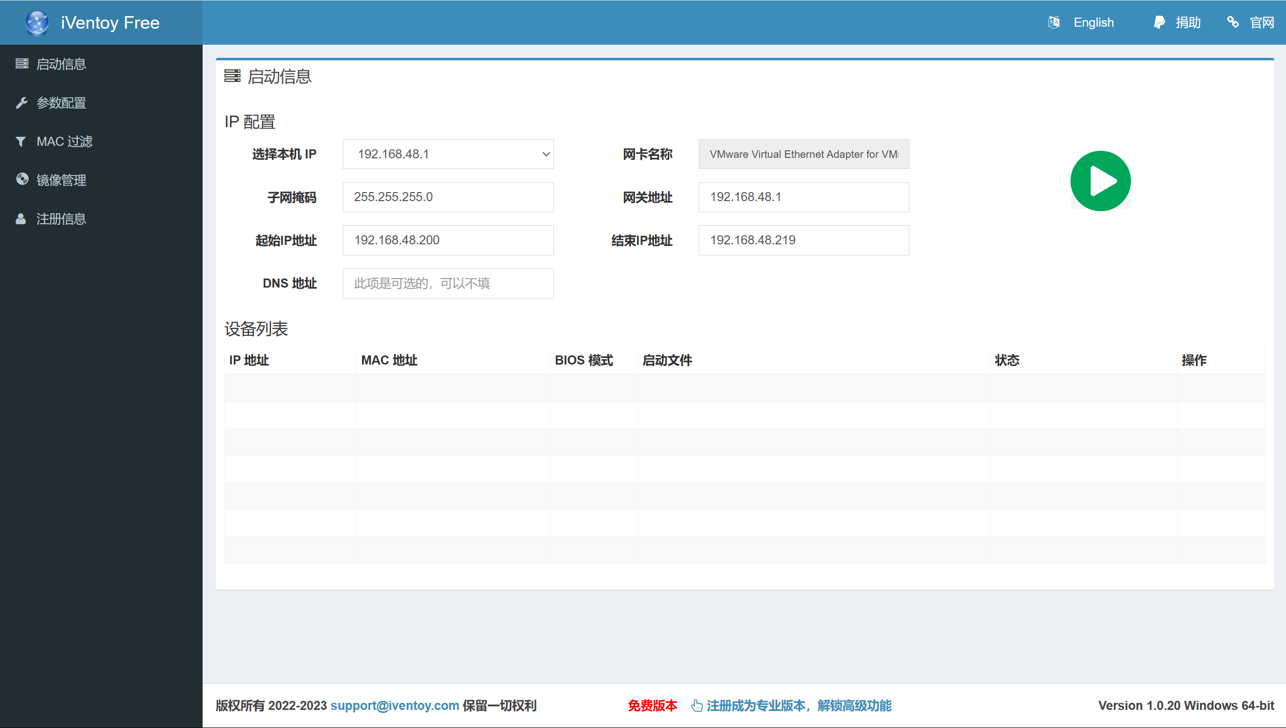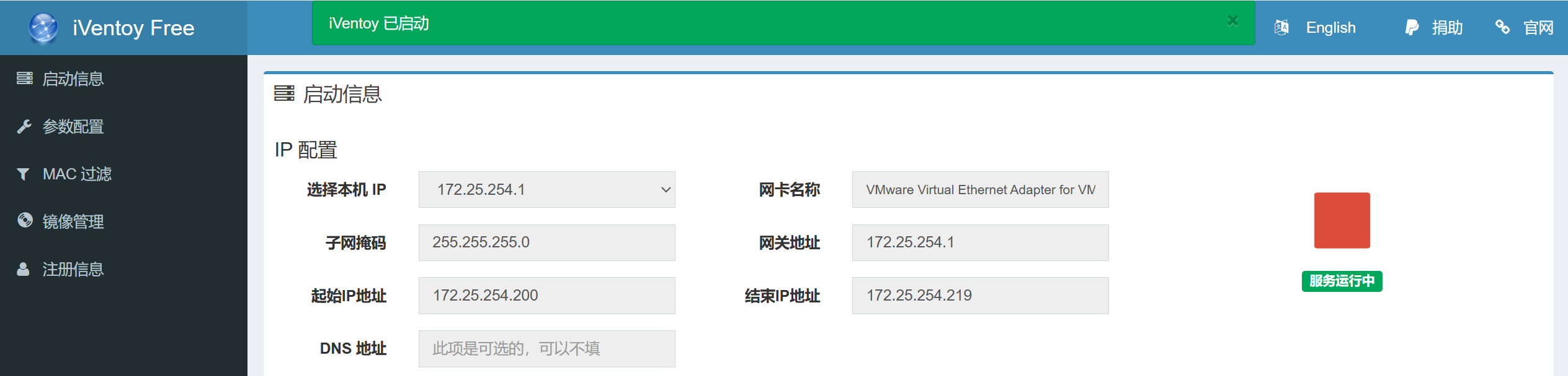 在 iVentoy 主界面上选择本机 IP 地址,根据之前的分析设置好 IP 地址池,然后点击绿色的开始按钮即可