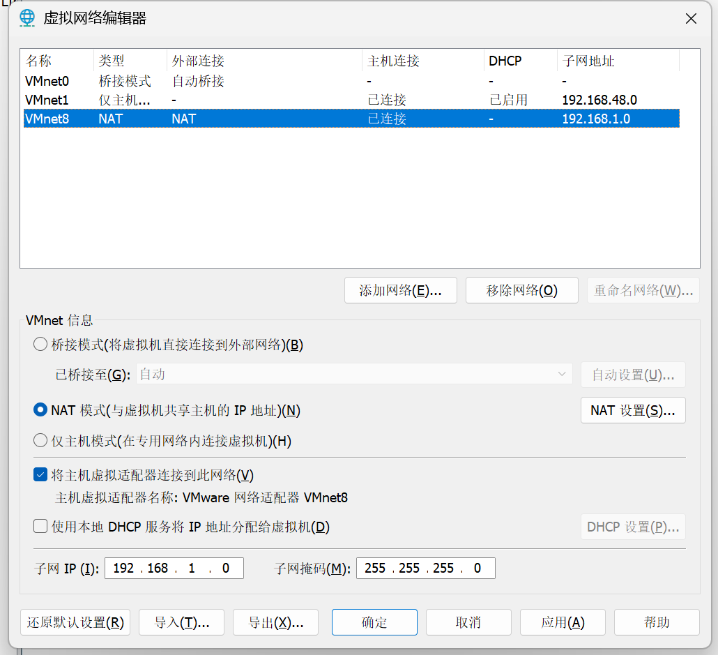 打开vmware17→编辑菜单→虚拟网络编辑器→VMnet8 NAT 网卡查看网段,点击NAT设置查看网关地址