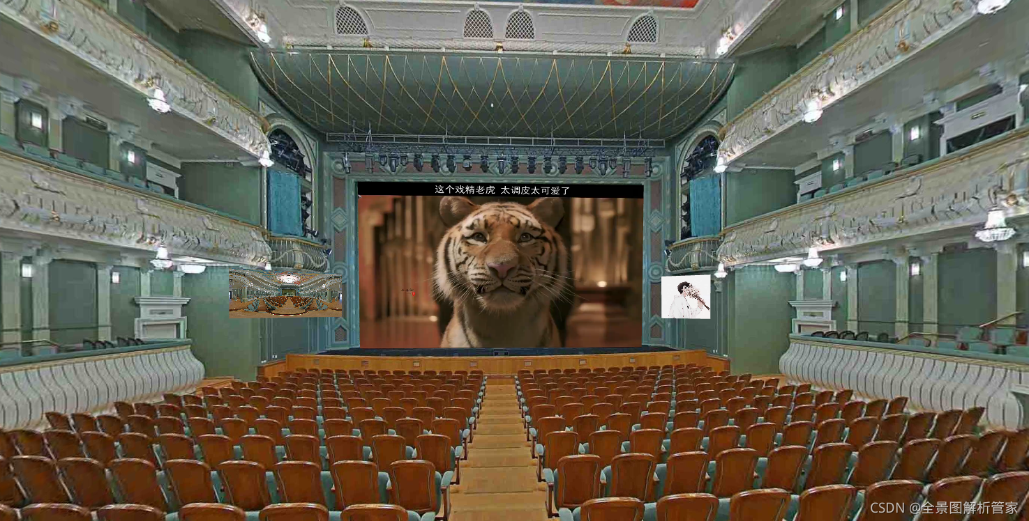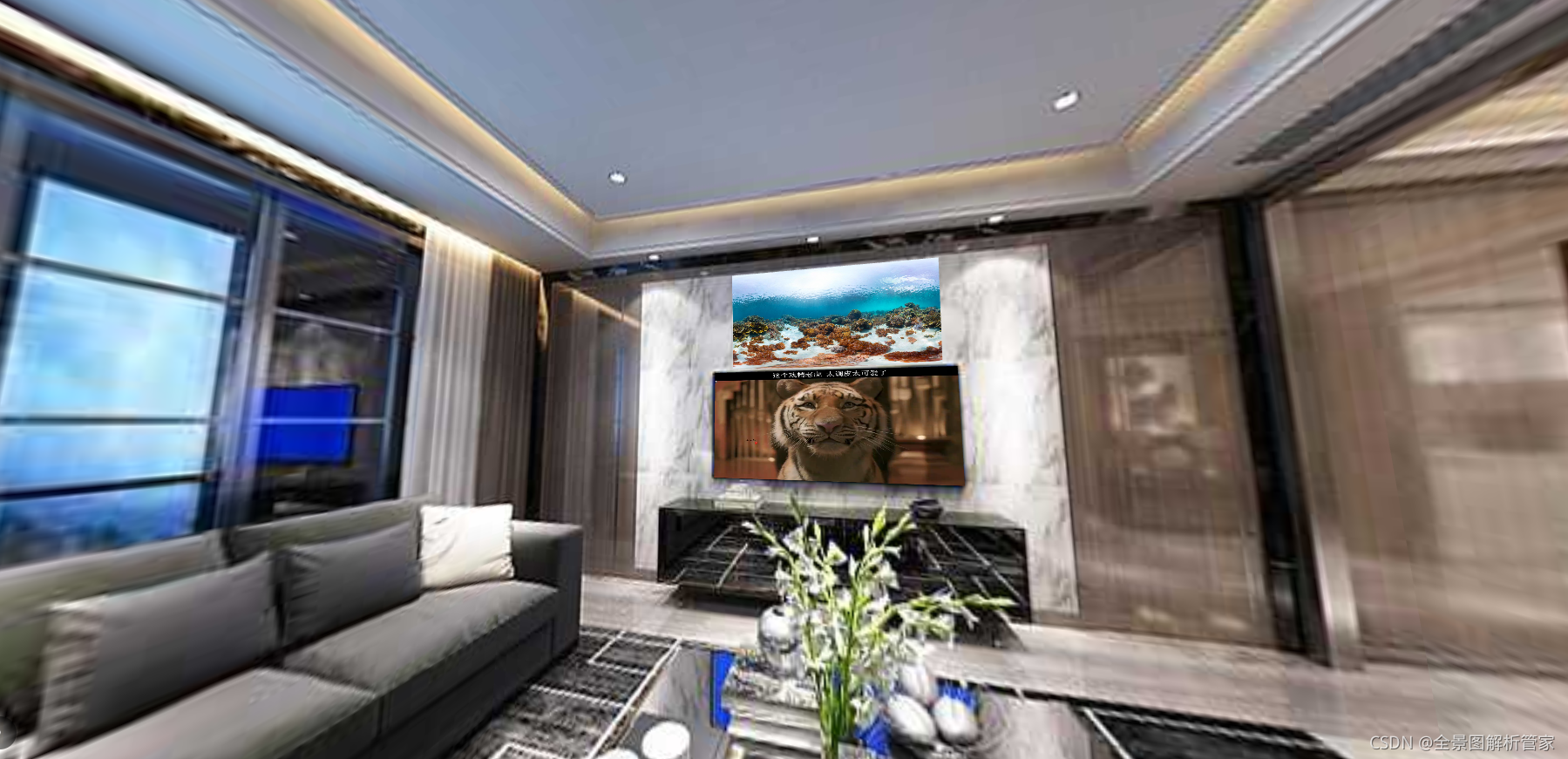 下面这张全景图在电视上嵌入了视频,可手动关闭和播放,看上去像不像真的在播放电视呢?