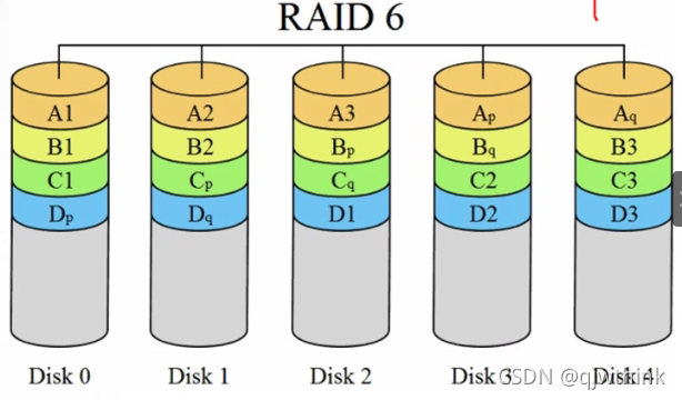 2、与RAID 5相比,RAID 6增加了第二个独立的奇偶校验信息块