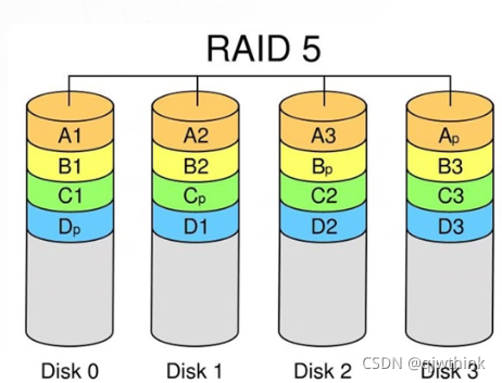 1、N(N>=3)块盘组成阵列,一份数据产生N-1个条带,同时还有1份校验数据,共N份数据在N块盘上循环均衡存储