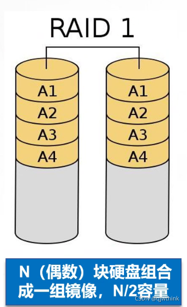 1、通过磁盘数据镜像实现数据冗余,在成对的独立磁盘上产生互为备份的数据