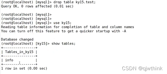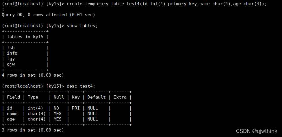 临时表创建成功之后,使用SHOWTABLES命令是看不到创建的临时表的,临时表会在连接退出后被销毁。如果在退出连接之前,也可以可执行增删改查等操作,比如使用DROP TABLE语句手动直接删除临时表。