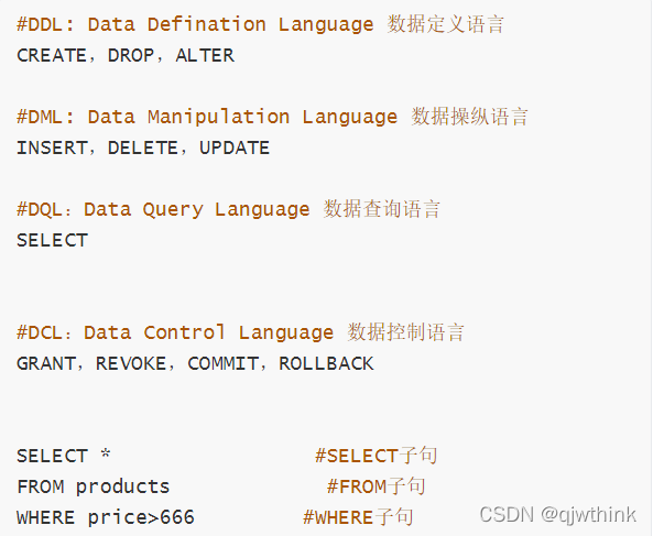 (数据控制语句,用于控制不通数据段直接的许可和访问级别的语句,这些语句定义了数据库、表、字段、用户的访问权限和安全级别,如COMMIT、ROLLBACK、GRANT、REVOKE)