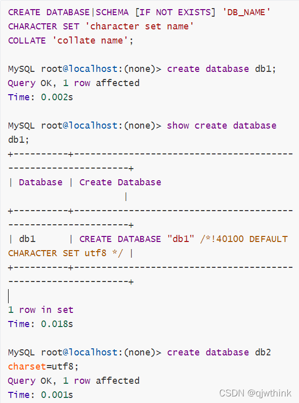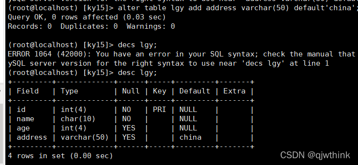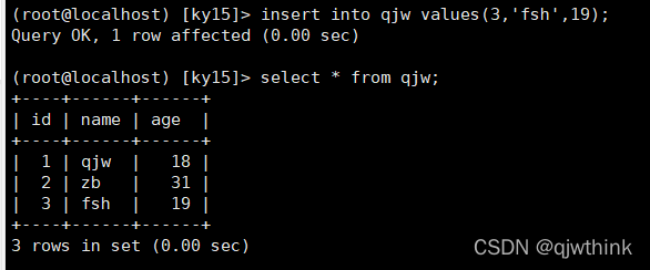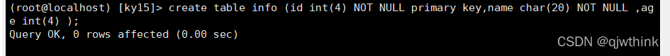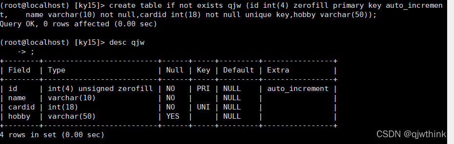 create table if not exists qjw (id int(4) zerofill primary key auto_increment, name varchar(10) not null,cardid int(18) not null unique key,hobby varchar(50));