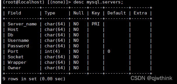 desc mysql.servers;#不想先使用use进入数据库查看表可以使用上面的