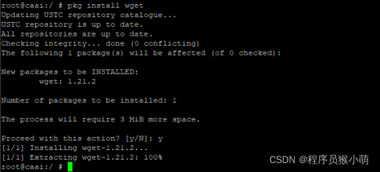 以root用户在命令行中输入pkg install wget,然后按照提示操作即可安装编译好的Wget程序。