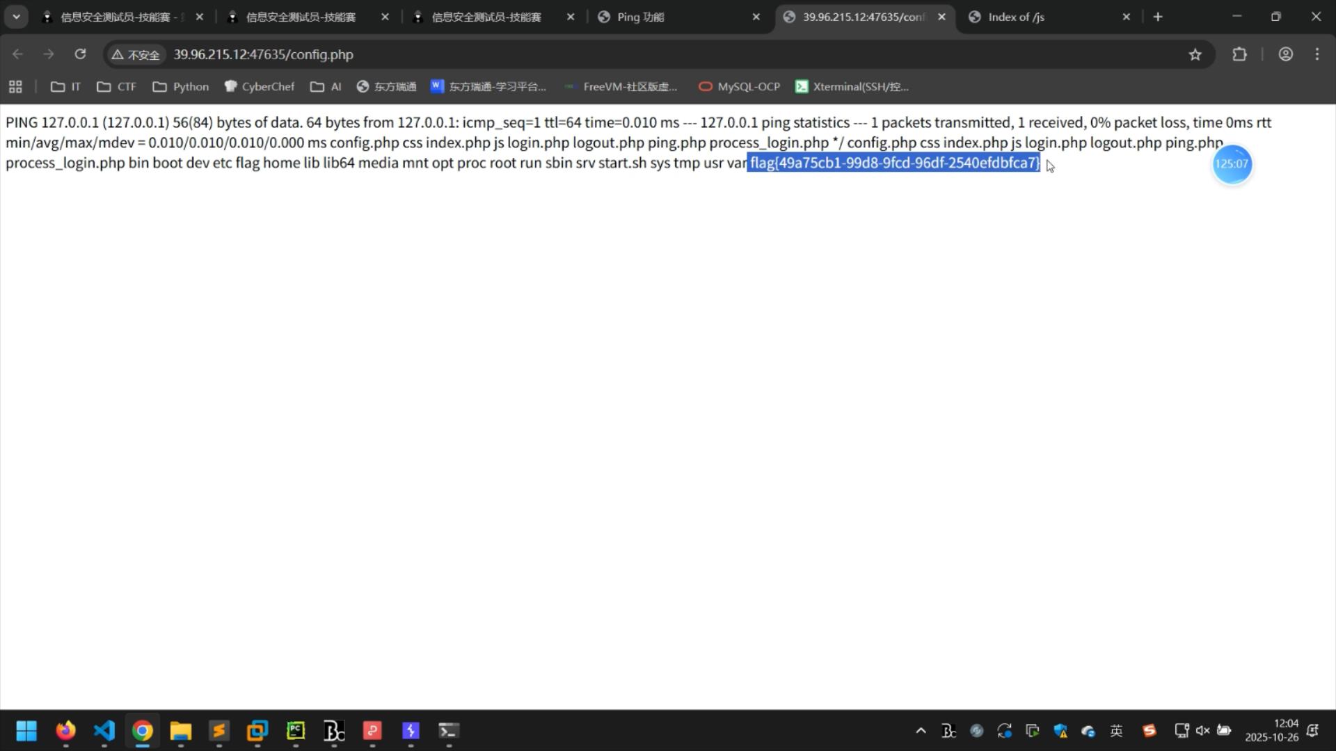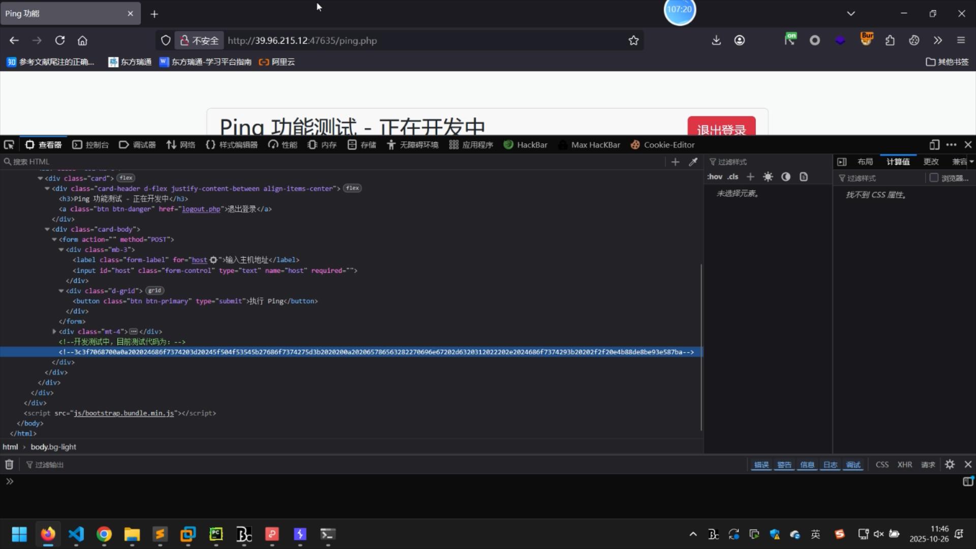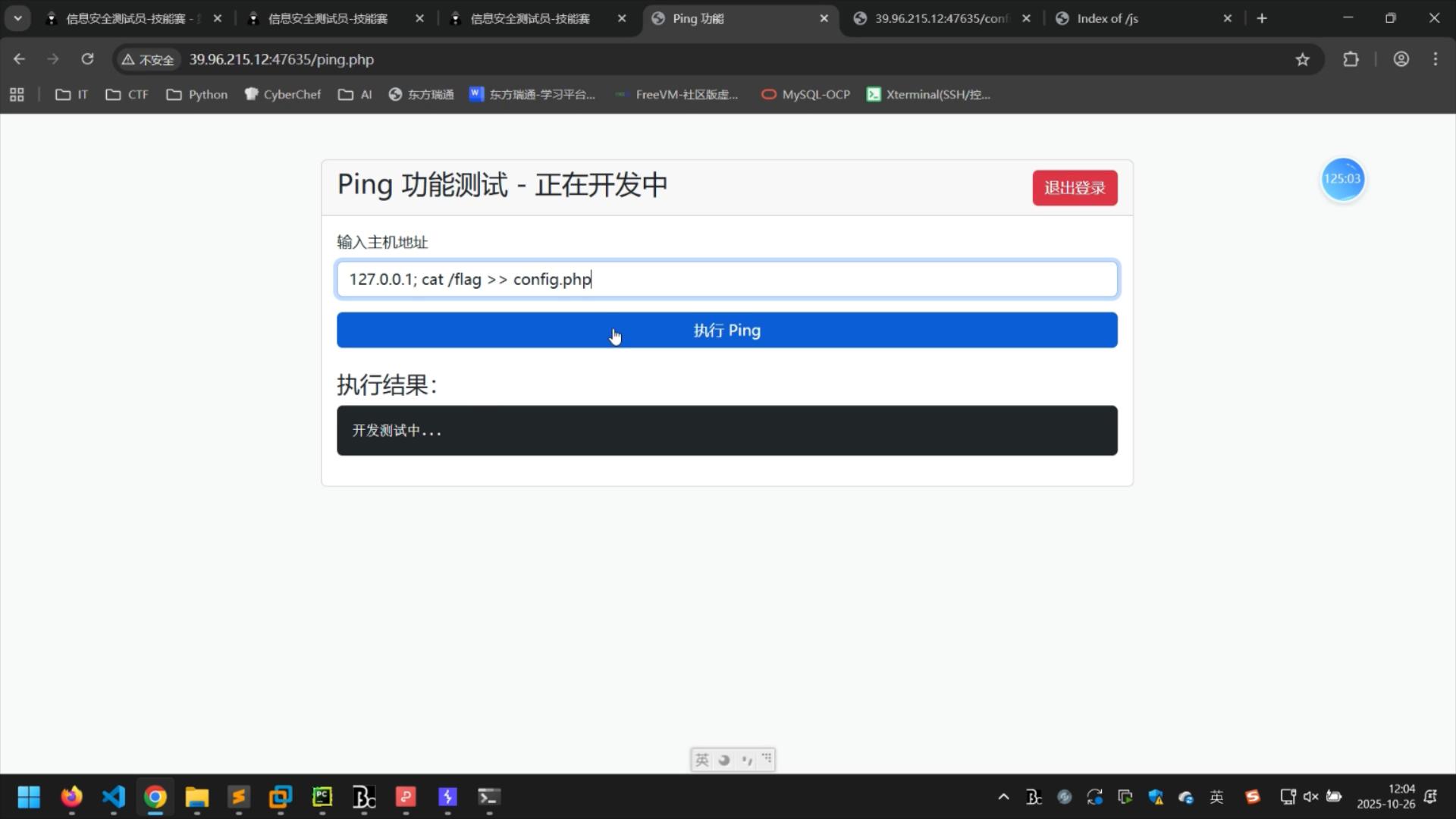 登录进去是ping.php。F12看到提示,base64解密后发现命令可以堆叠但没有回显。