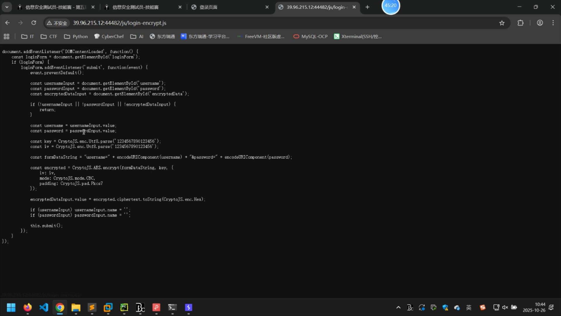 其中login-encrypt.js是加密代码。逻辑是AES的CBC模式加密,key = '1234567890123456',iv = '1234567890123456',对拼接字符串加密 plain_str = 'username=' + username + '&password=' + password。