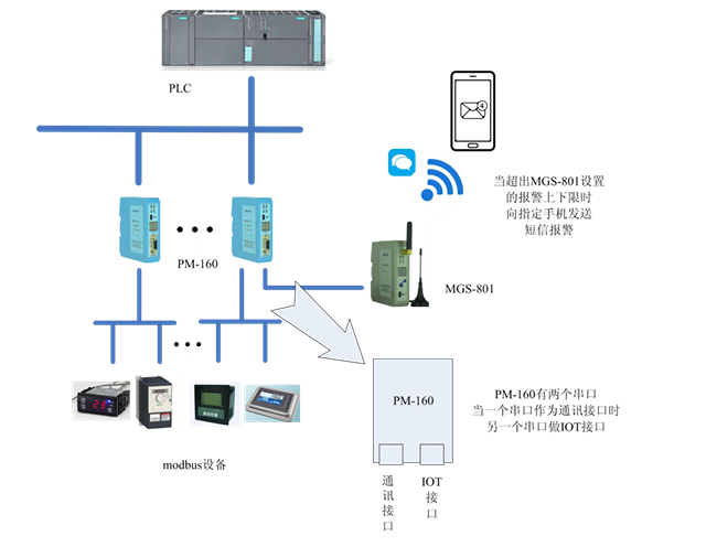 监视PLC和Modbus设备的状态,并通过短信报警的方式来让客户知晓设备状态。具体连接方式如下图所示。