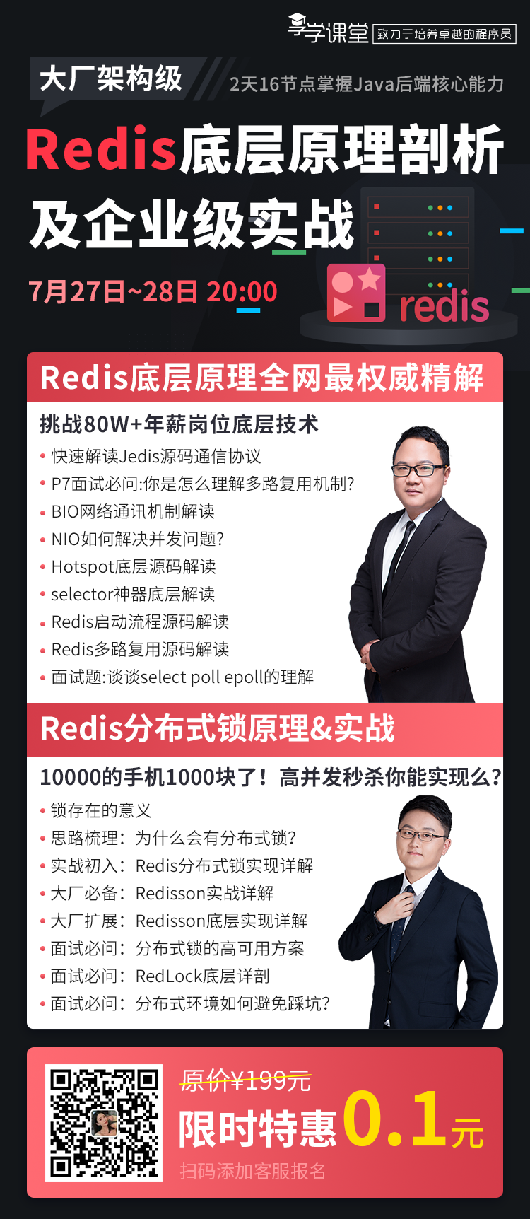 7月27日 - 28日 2天时间,带你从入门到BAT各种应用场景Redis设计,深度掌握Redis核心技能,快速进阶成为 Redis专家!图文并茂, 真实揭秘大厂面试套路,深入底层原理分析 Redis 连环炮问题!帮你体系的梳理源码的学习路线以及高效的学习方法,并且结合实战来带你分析高频面试问题。