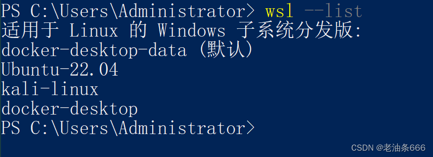 上述代码将wsl子系统的IP地址固定为了192.168.60.2,可自定义。其中的Ubuntu-22.04这个也是个视情况而定的字符串,具体根据实际情况需要进行替换,一般使用wsl --list命令就可罗列出自己安装的wsl子系统版本,我的如下: