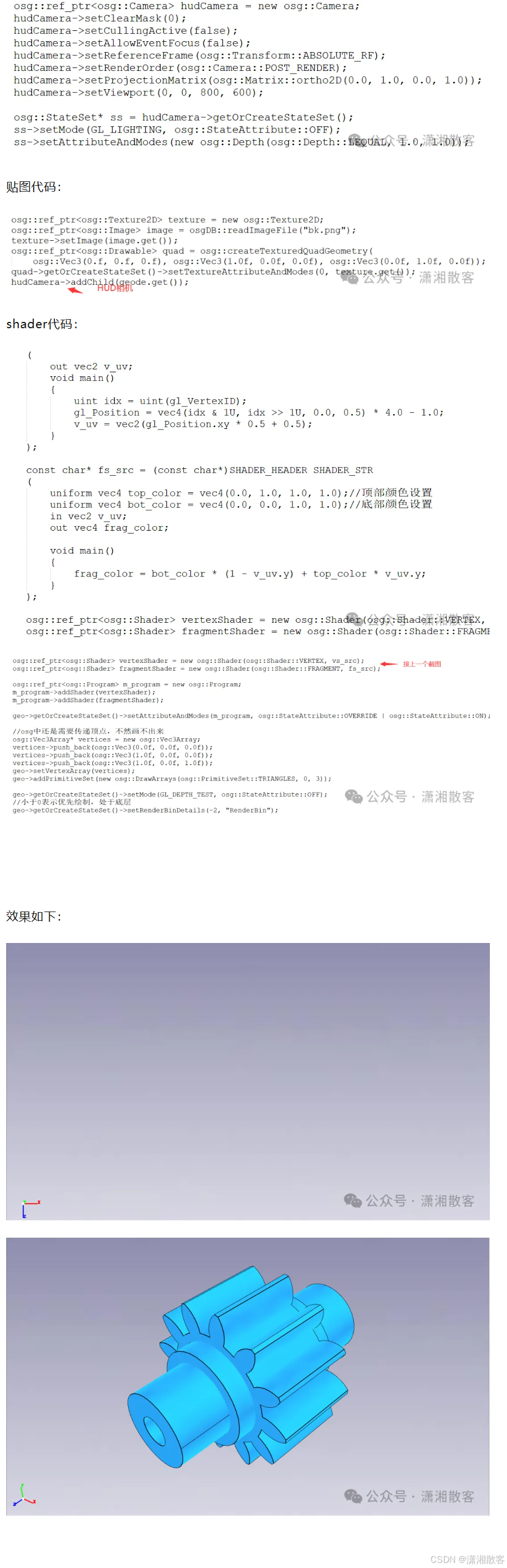 OSG的背景设置有一个接口是setclearColor,输入颜色值就能设置背景,这个设置是单色背景,如果想做一个高级点的背景,比如渐变色,我们有多种方法,第一个是使用shader +HUD相机;第二种是加载图片 + HUD相机。