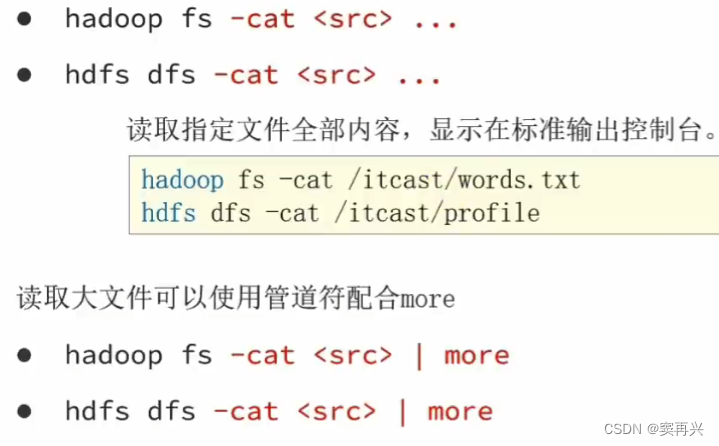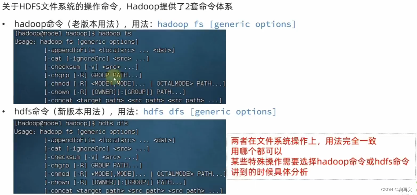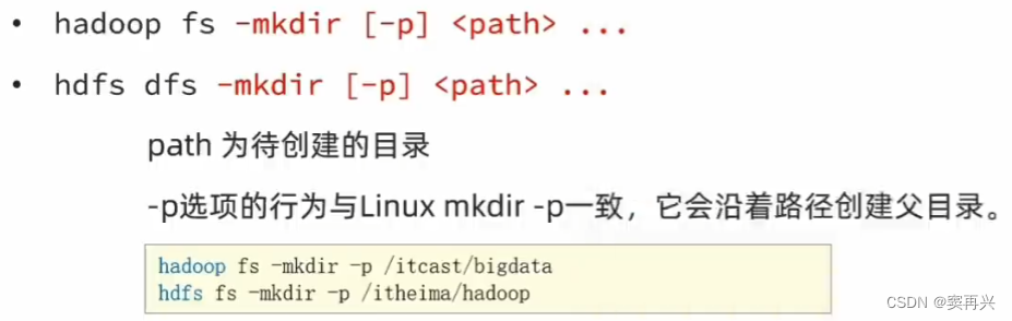 HDFS 的目录形式和 Linux 一样,命令名称和 Linux 几乎一样,在前面加上特定的关键字即可