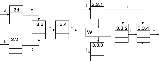 图5-4-7中的父图和子图是平衡的,但子图中的文件W并没在父图中出现。这是由于对文件W的读、写完全局限在加工3.3之内,在父图中各个加工之间的界面上不出现,该文件是子图的局部文件或为临时文件。