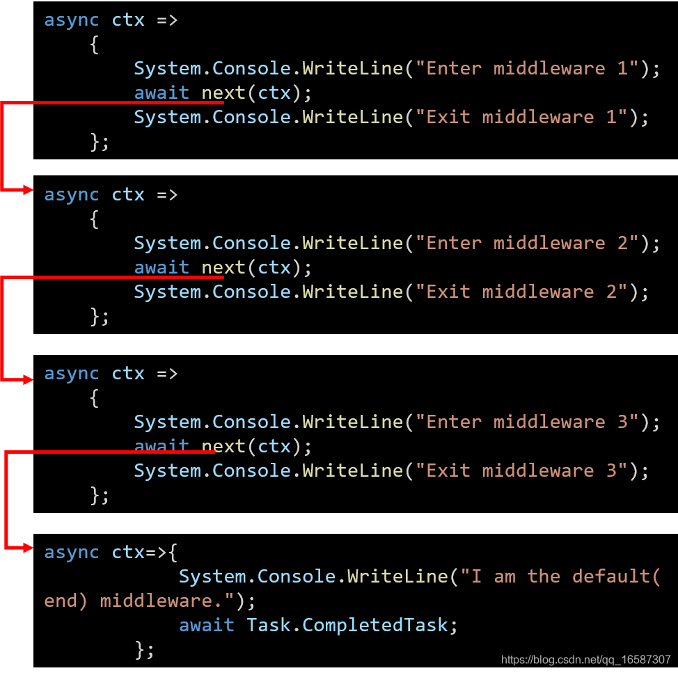 我们称RequestDelegate是"具体的中间件",说它是具体的中间件,是因为其实它就是一个具体的方法。