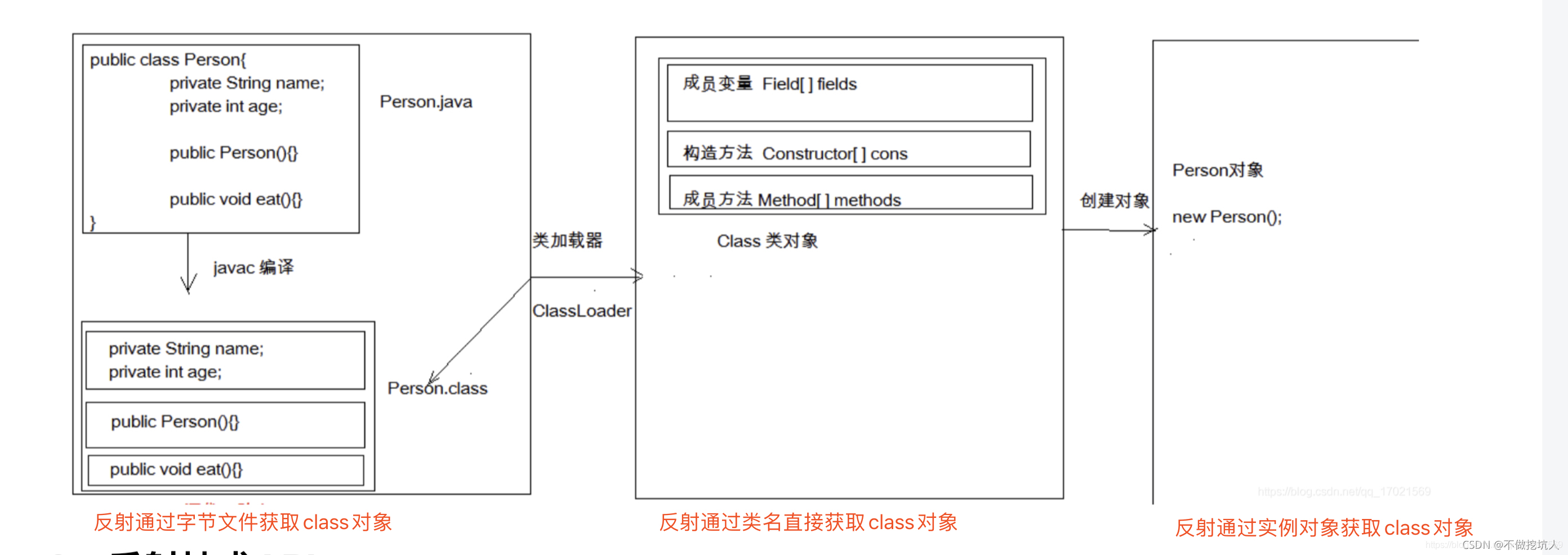 获得字节码对象Class之后,可以获得无参和有参构造方法,然后可以通过构造方法调用newInstance()创建对象