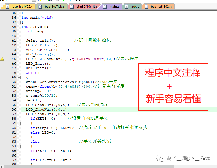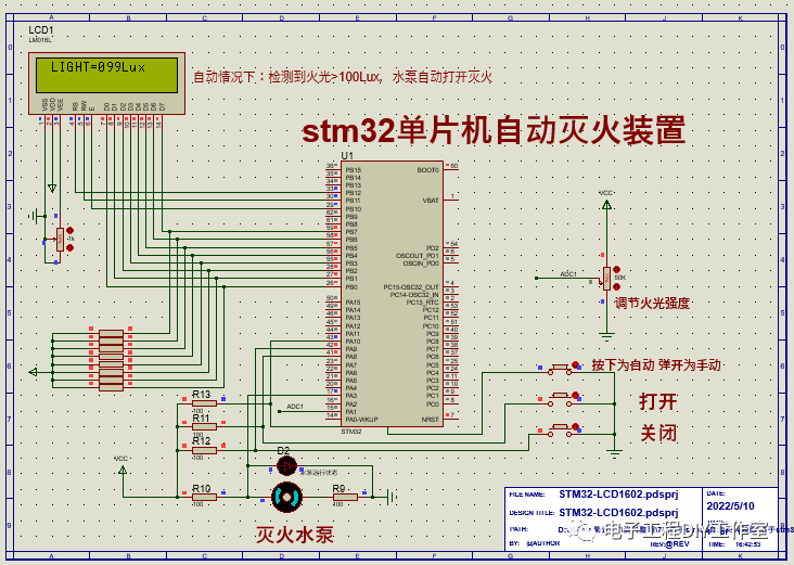 火焰传感器的原理:是通过感知外部特殊波段光照强度的突变来判断是否出现火灾,该仿真采用ADC采集光照强度,发现有火焰情况,自动打开水泵进行灭火,也可以设置为手动模式,进行手动打开\关闭水泵。