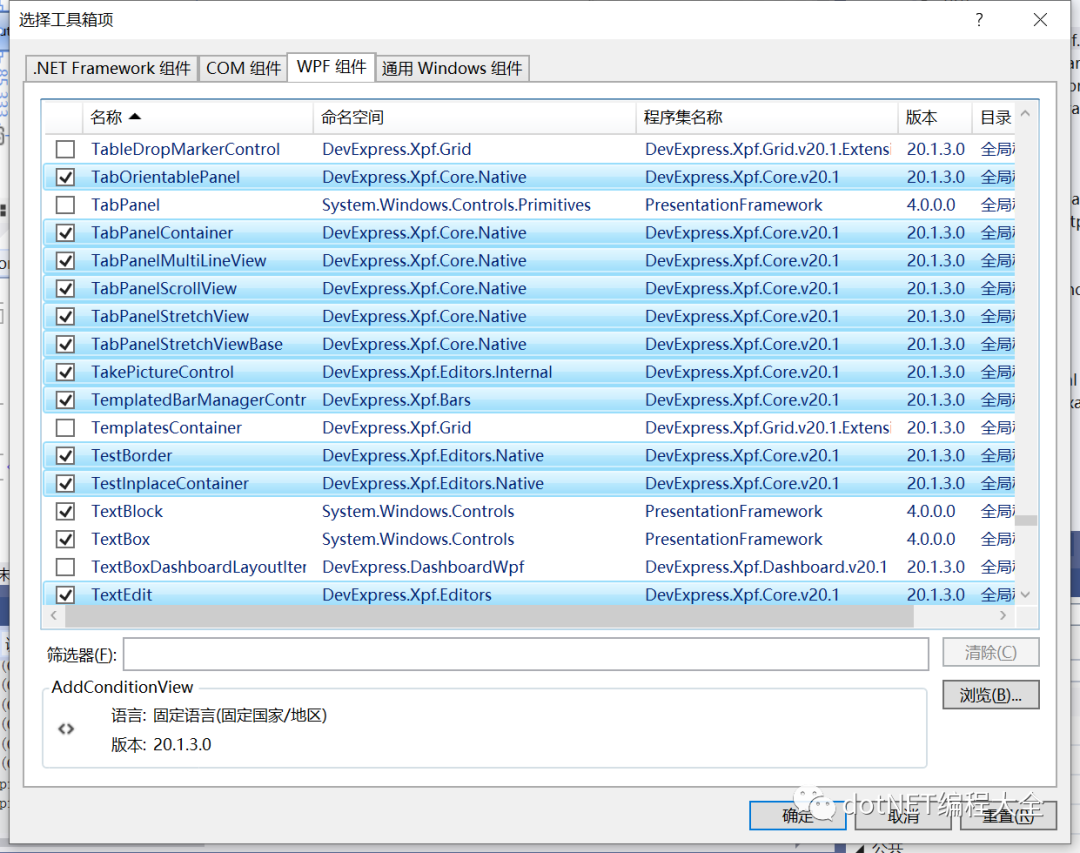 ②在工具箱右键-》选择项-》wpf组件中浏览需要添加的库,然后确定